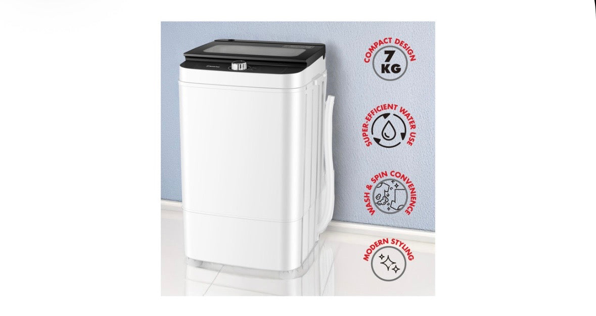 With a 7kg capacity, it’s ideal for everyday laundry loads, offering single tub functionality that combines washing and spinning in one easy-to-use unit. The intuitive dial control allows for quick selection of wash and spin settings, while the energy-efficient operation helps reduce water and electricity usage.